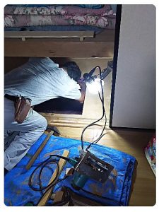 今回は、シロアリ防除と駆除の依頼を頂きました。日置市リフォーム補助金は使えませんので、費用面で頑張らせて頂きます。しかしながら、このお家は全て板の間で 床下に入る場所がありませんでしたので、