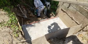 流出部を掘削してコンクリートブロックを積み流出を止めます。