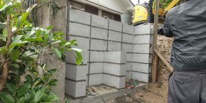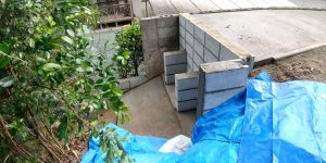 既設の現場打擁壁に鉄筋で結合し、底盤の上に土留めのコンクリートブロックを積み上げて土砂を戻します。